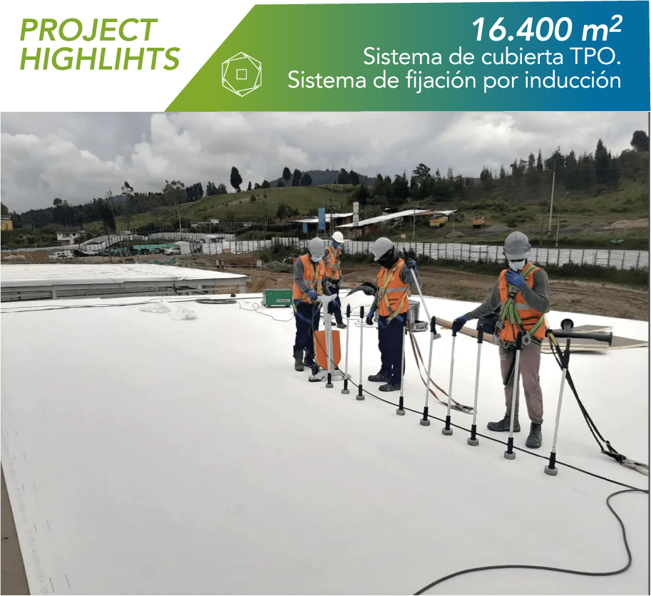 Para esta nueva planta de producción y alineado con la razón de ser de la compañía, la seguridad es un factor fundamental, motivo por el cual Los sistemas constructivos elegidos en el proyecto deben cumplir los más altos estándares internacionales con certificación FM Global. Basados en este requerimiento, el equipo técnico de Sukot Roofing SAS propone un sistema de cubierta de baja pendiente, 100% estanque, con membrana TPO y aislamiento térmico ISO 95+ GL